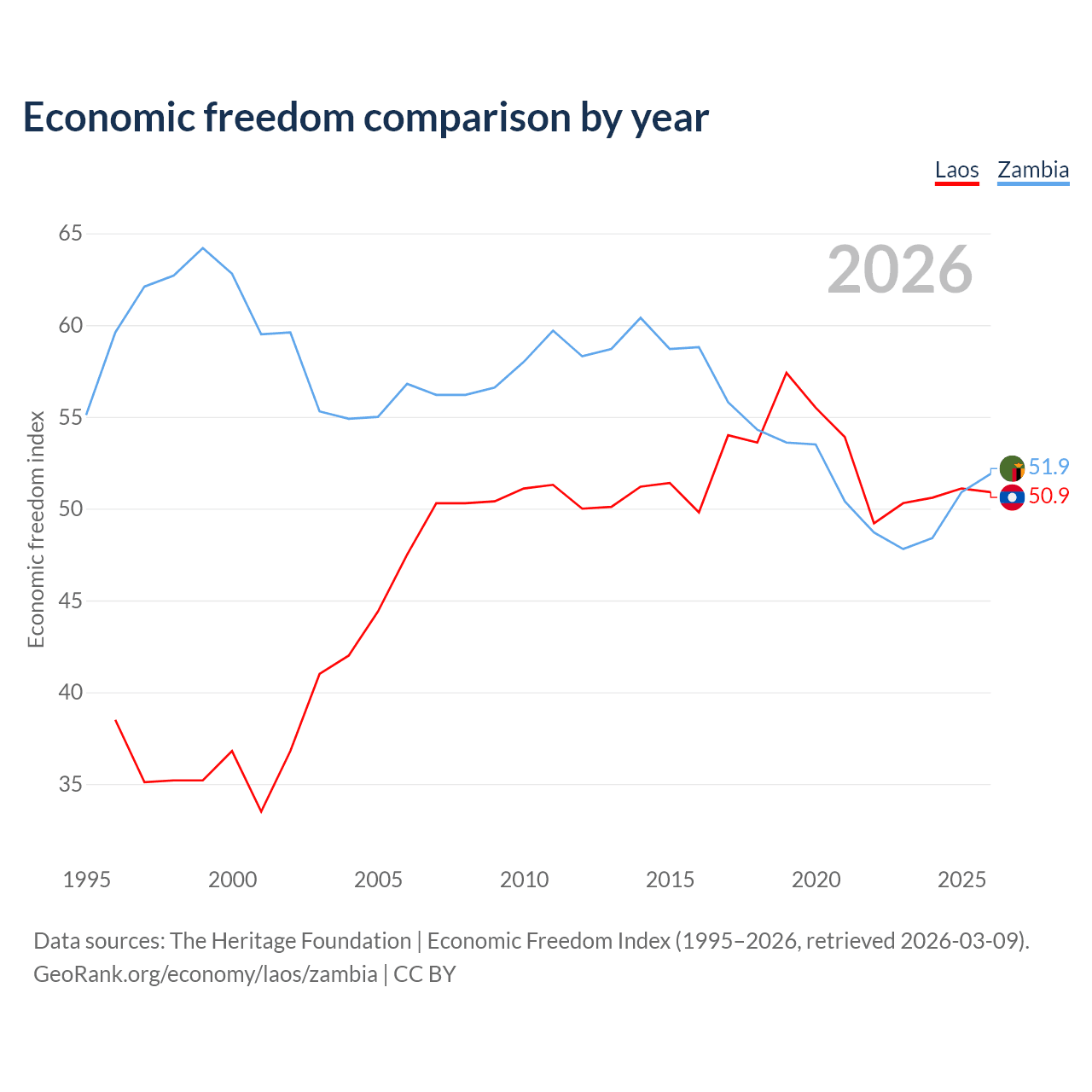 The Economic Freedom Index for Laos is 50.9, ranking 157/197, compared to 51.9 for Zambia, ranking 152/197. The chart above displays a comparison of annual changes in economic freedom indexes.