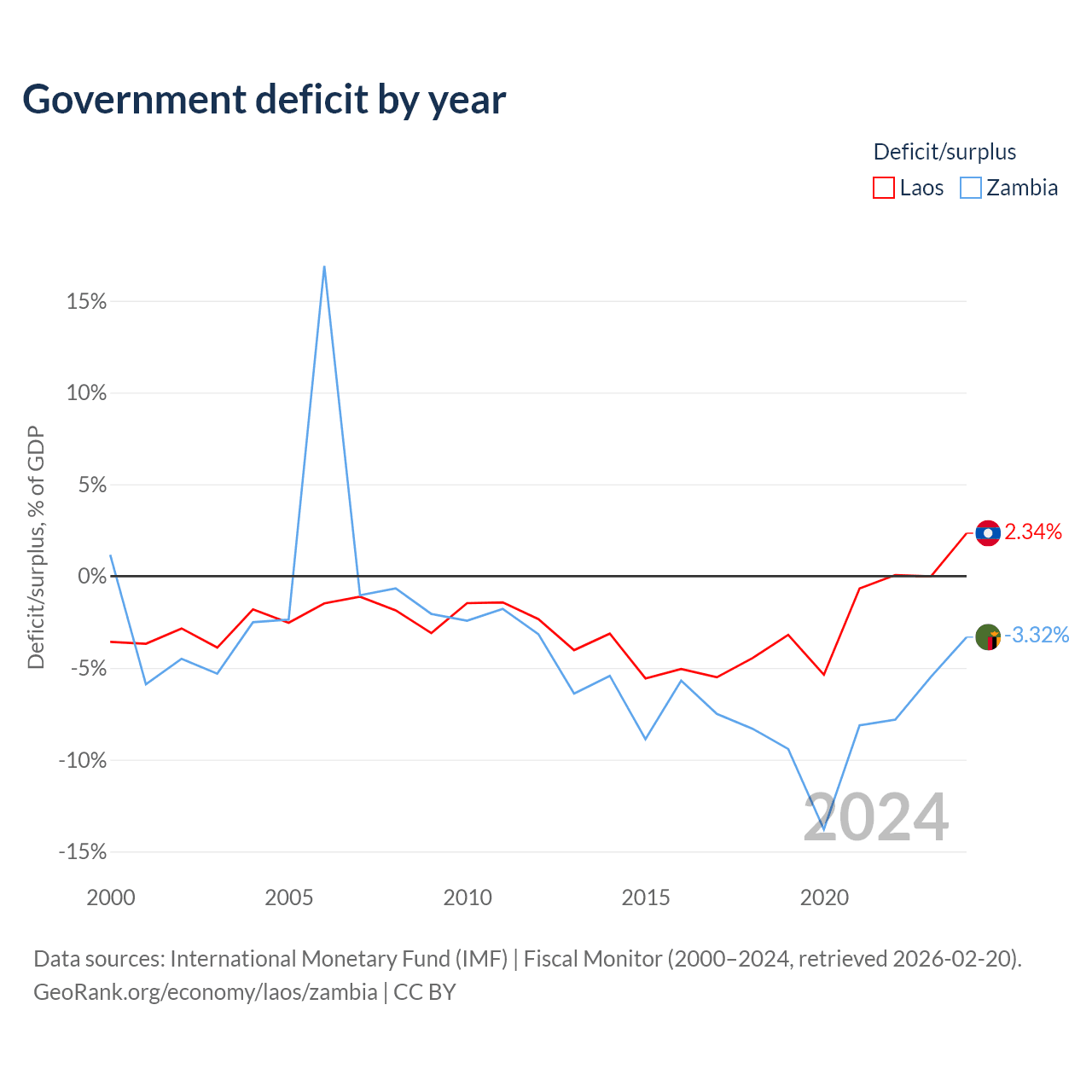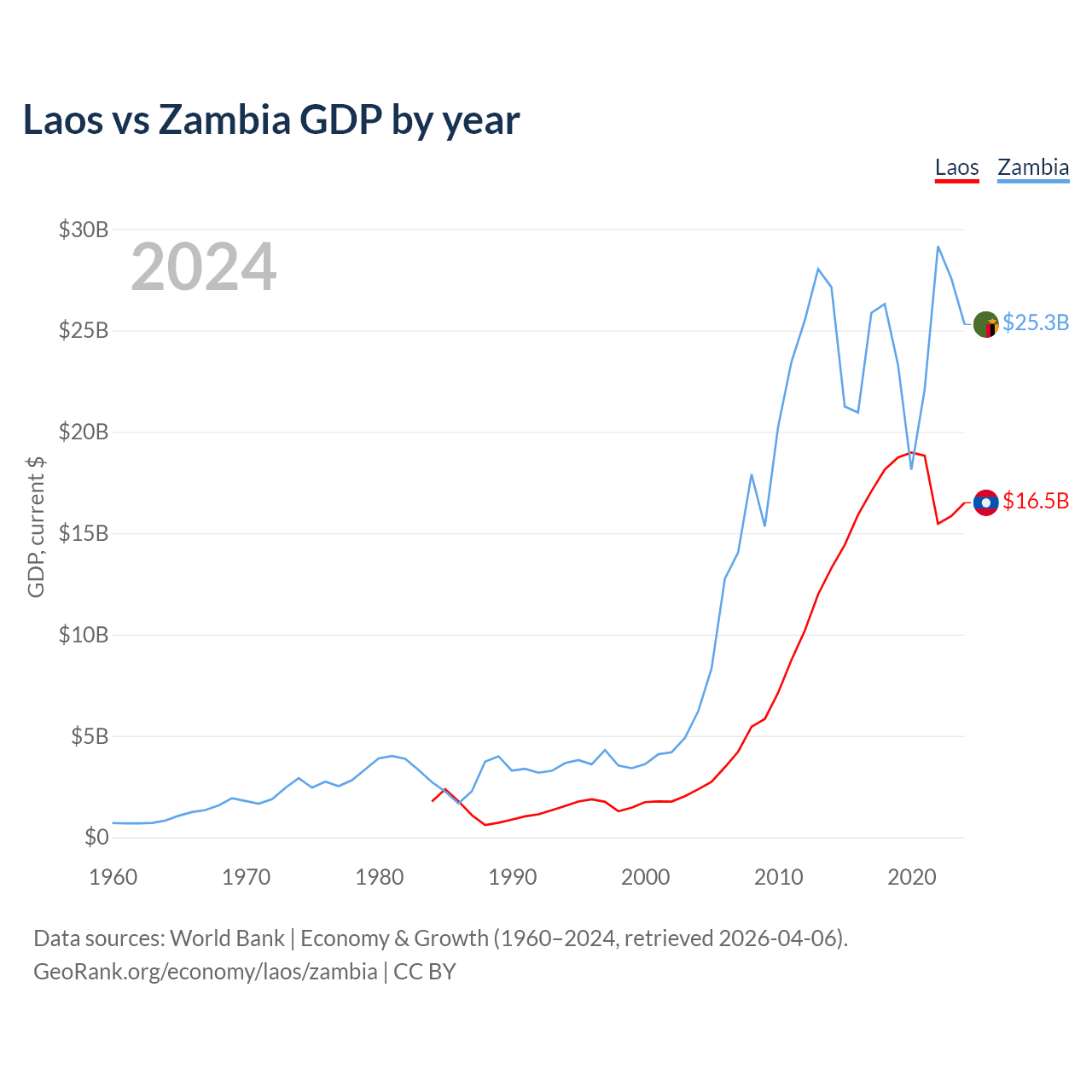 Laos has a GDP of $16.5B compared to $25.3B for Zambia, ranking 139/197 and 116/197 by economy size, respectively.