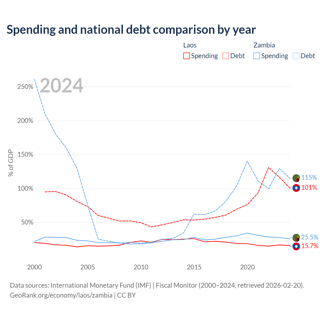 Laos has $16.6B in government debt (100.5% of GDP), compared to $29.1B (114.9% of GDP) in Zambia.