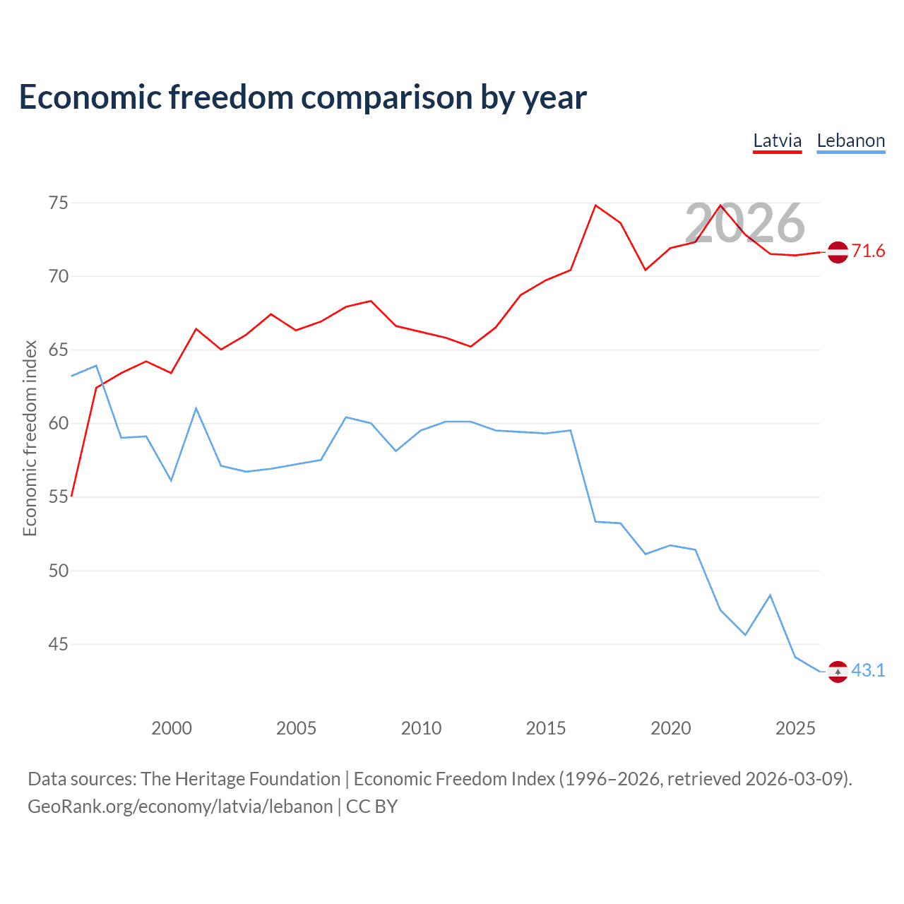 The Economic Freedom Index for Latvia is 71.6, ranking 31/197, compared to 43.1 for Lebanon, ranking 183/197. The chart above displays a comparison of annual changes in economic freedom indexes.