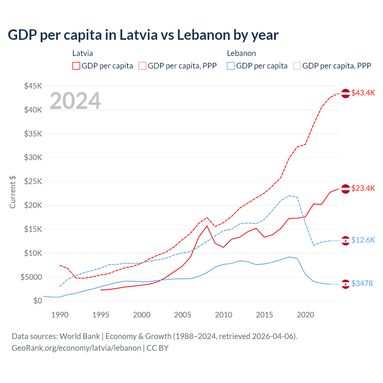 GDP per capita in Latvia vs Lebanon by year