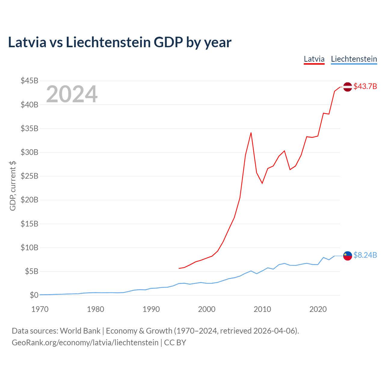 Latvia has a GDP of $43.7B compared to $8.24B for Liechtenstein, ranking 99/197 and 156/197 by economy size, respectively.