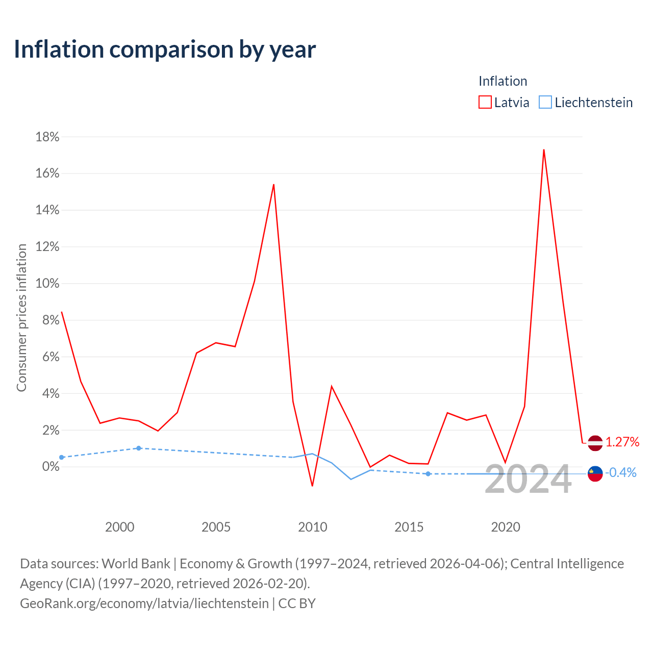 Over the past 24 years, Latvia has recorded an average annual inflation rate of 3.71%, compared with 0.04% in Liechtenstein. In 2020, inflation was 1.27% in Latvia and -0.4% in Liechtenstein.
