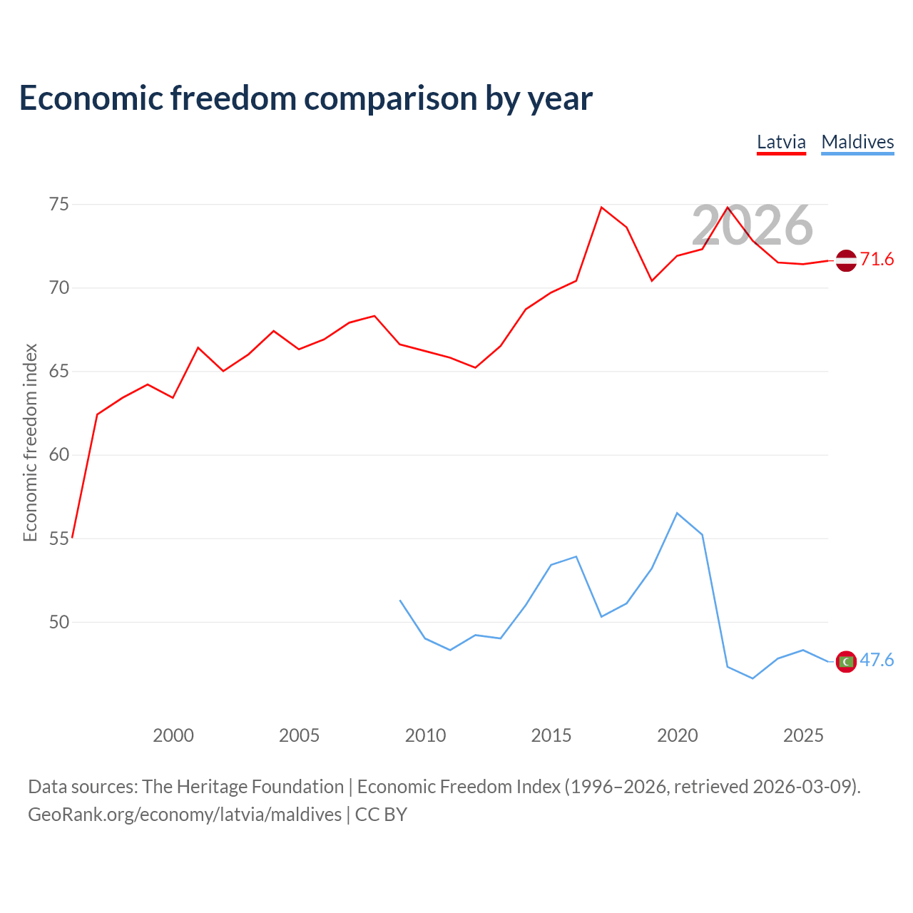 The Economic Freedom Index for Latvia is 71.6, ranking 31/197, compared to 47.6 for Maldives, ranking 174/197. The chart above displays a comparison of annual changes in economic freedom indexes.