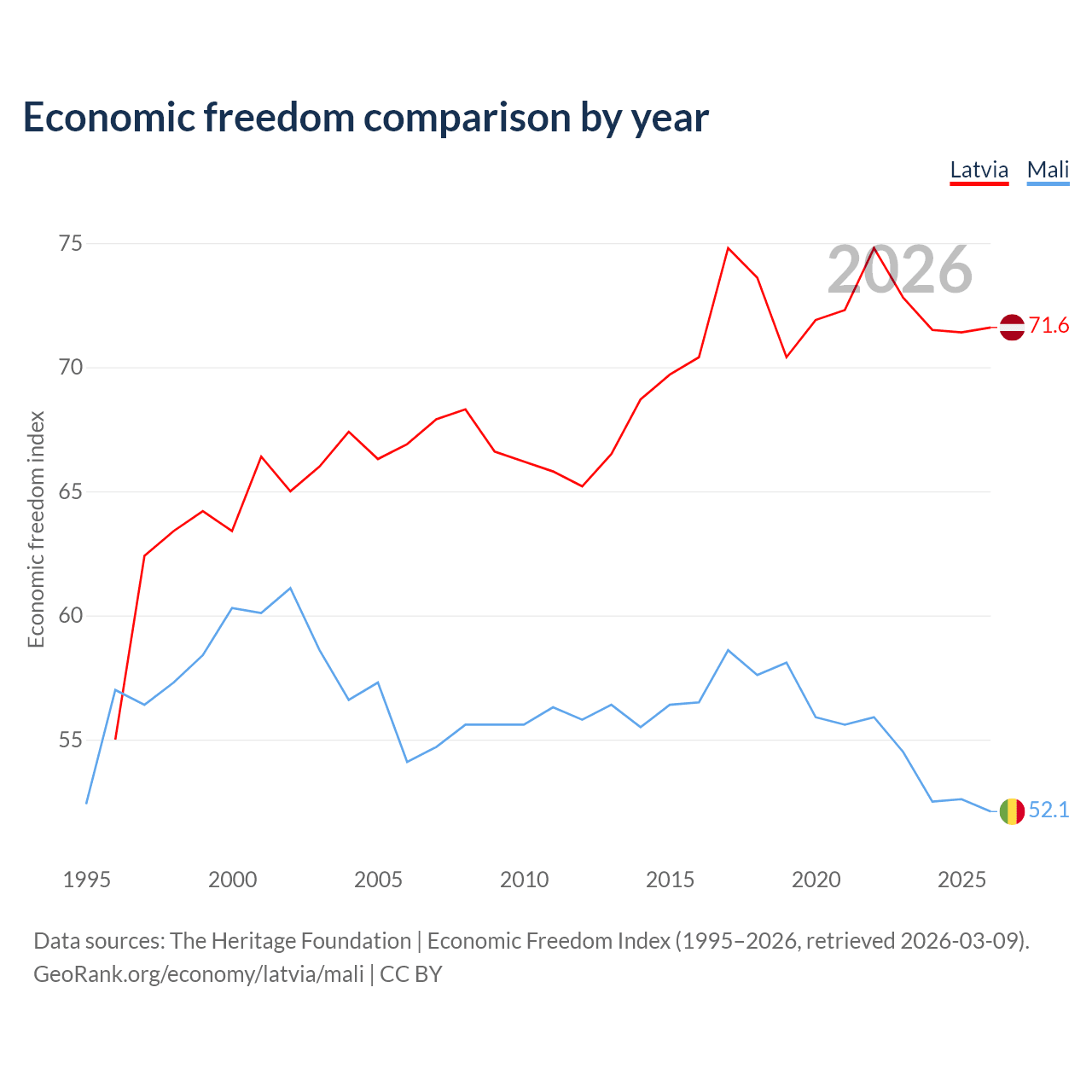 The Economic Freedom Index for Latvia is 71.6, ranking 31/197, compared to 52.1 for Mali, ranking 150/197. The chart above displays a comparison of annual changes in economic freedom indexes.