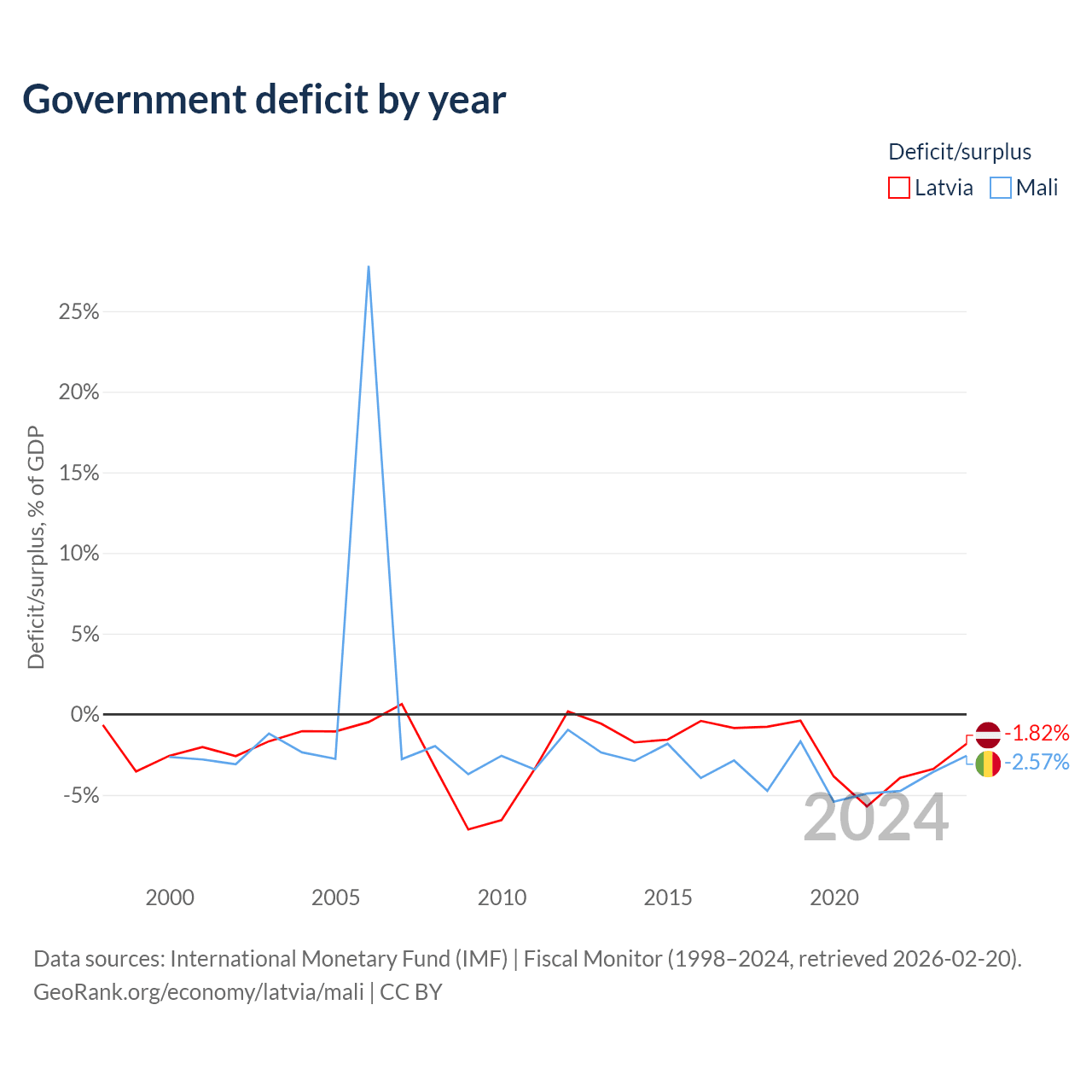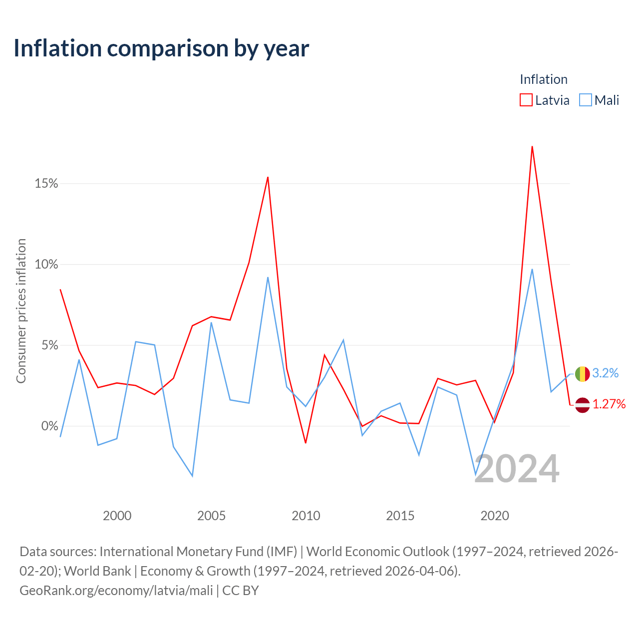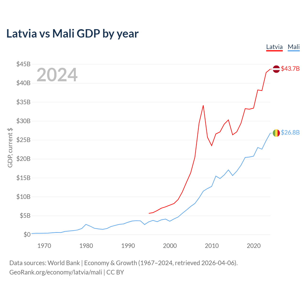 Latvia has a GDP of $43.7B compared to $26.8B for Mali, ranking 99/197 and 113/197 by economy size, respectively.