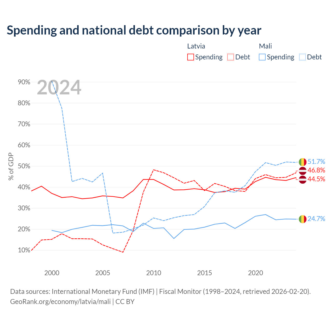 Latvia has $20.4B in government debt (46.8% of GDP), compared to $13.9B (51.7% of GDP) in Mali.