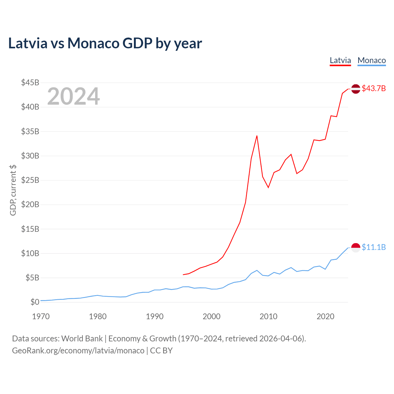 Latvia has a GDP of $43.7B compared to $11.1B for Monaco, ranking 99/197 and 152/197 by economy size, respectively.