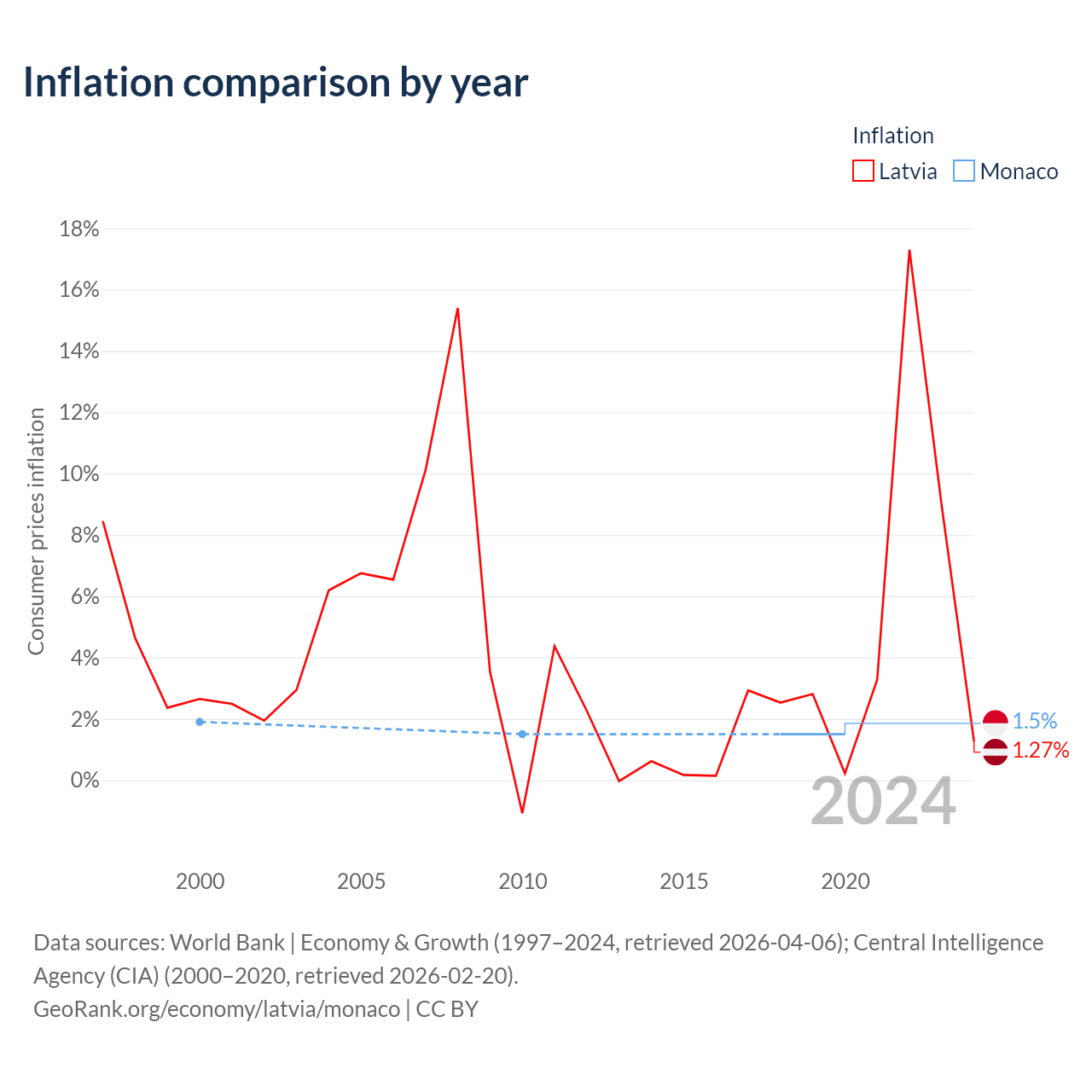 Over the past 21 years, Latvia has recorded an average annual inflation rate of 3.5%, compared with 1.58% in Monaco. In 2020, inflation was 1.27% in Latvia and 1.5% in Monaco.