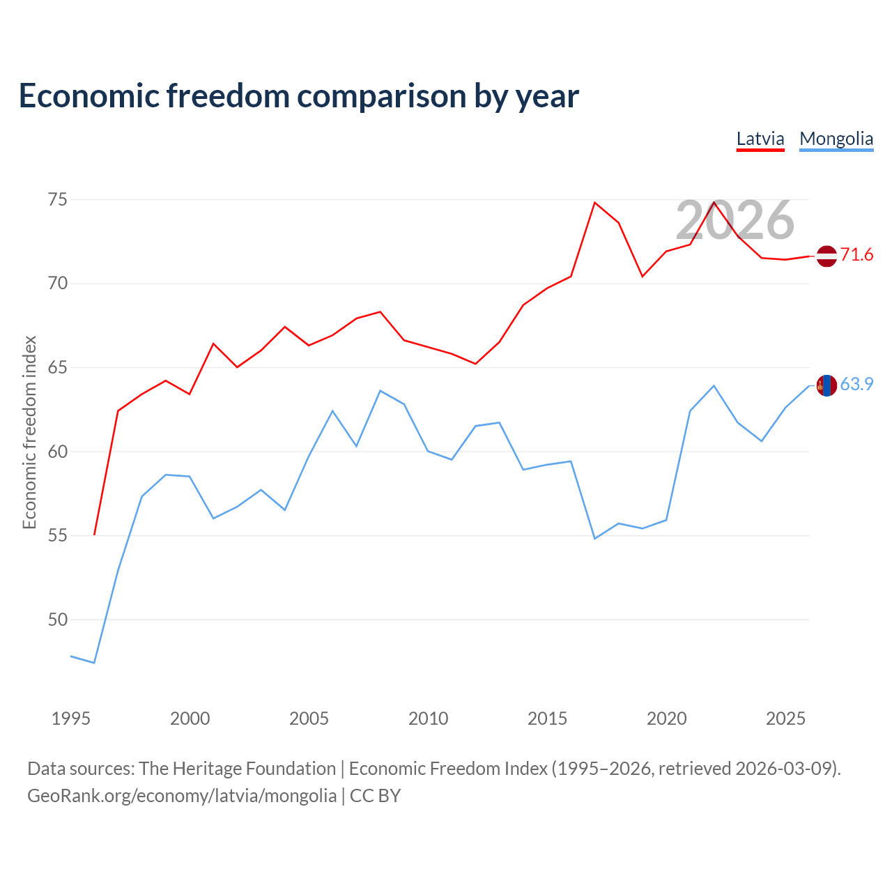 The Economic Freedom Index for Latvia is 71.6, ranking 31/197, compared to 63.9 for Mongolia, ranking 76/197. The chart above displays a comparison of annual changes in economic freedom indexes.