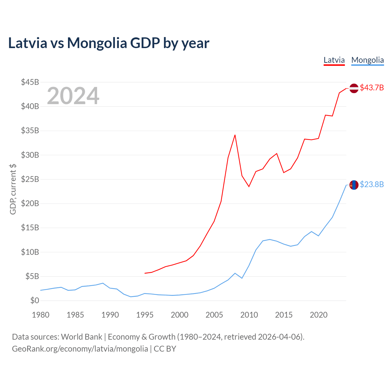 Latvia has a GDP of $43.7B compared to $23.8B for Mongolia, ranking 99/197 and 121/197 by economy size, respectively.