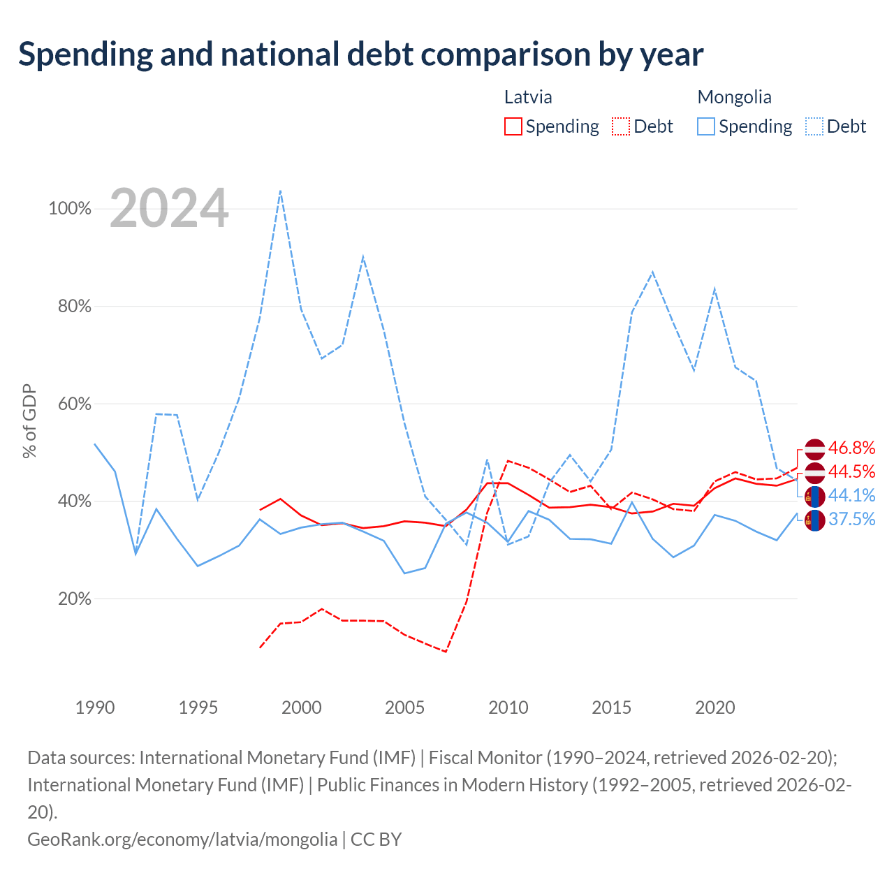 Latvia has $20.4B in government debt (46.8% of GDP), compared to $10.5B (44.1% of GDP) in Mongolia.
