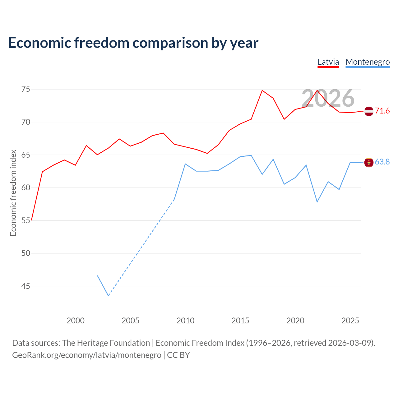 The Economic Freedom Index for Latvia is 71.6, ranking 31/197, compared to 63.8 for Montenegro, ranking 78/197. The chart above displays a comparison of annual changes in economic freedom indexes.