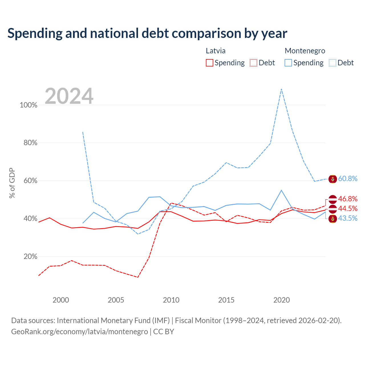 Latvia has $20.4B in government debt (46.8% of GDP), compared to $5.02B (60.8% of GDP) in Montenegro.