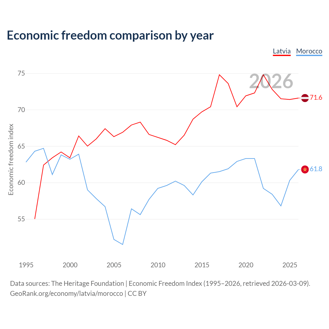 The Economic Freedom Index for Latvia is 71.6, ranking 31/197, compared to 61.8 for Morocco, ranking 91/197. The chart above displays a comparison of annual changes in economic freedom indexes.
