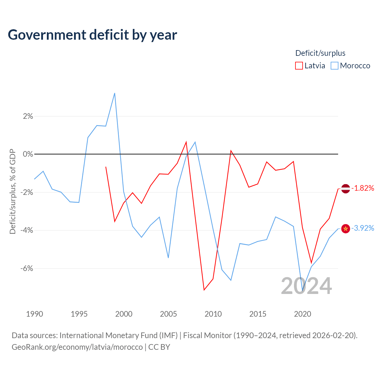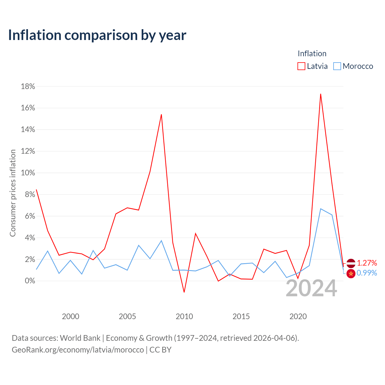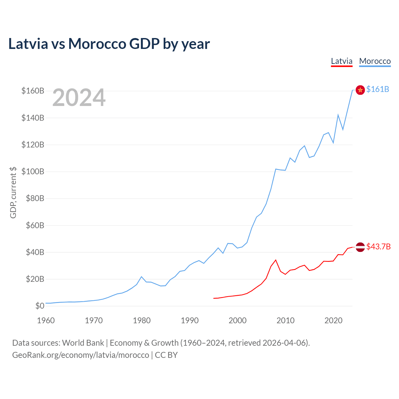 Latvia has a GDP of $43.7B compared to $161B for Morocco, ranking 99/197 and 58/197 by economy size, respectively.
