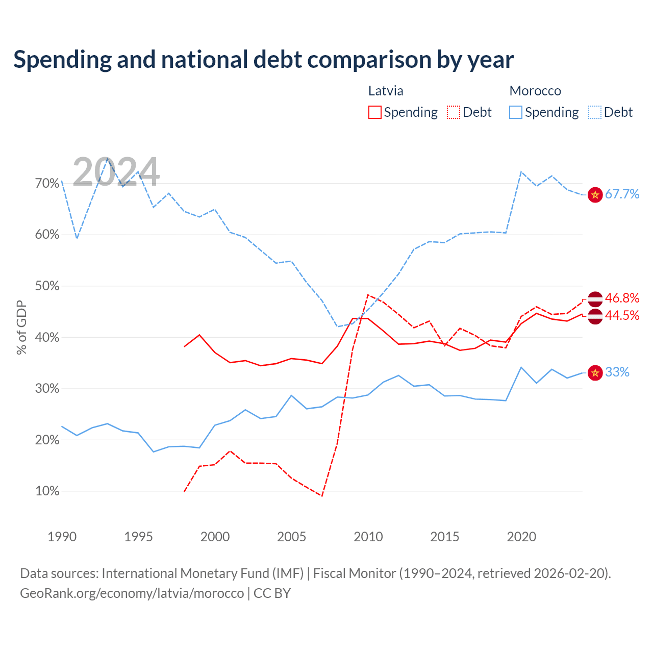 Latvia has $20.4B in government debt (46.8% of GDP), compared to $109B (67.7% of GDP) in Morocco.