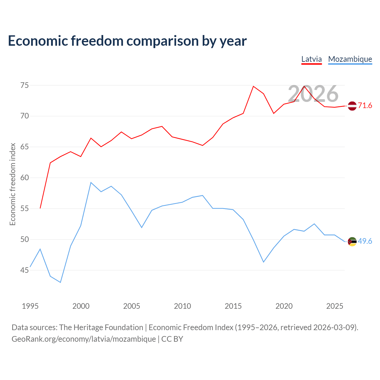 The Economic Freedom Index for Latvia is 71.6, ranking 31/197, compared to 49.6 for Mozambique, ranking 164/197. The chart above displays a comparison of annual changes in economic freedom indexes.