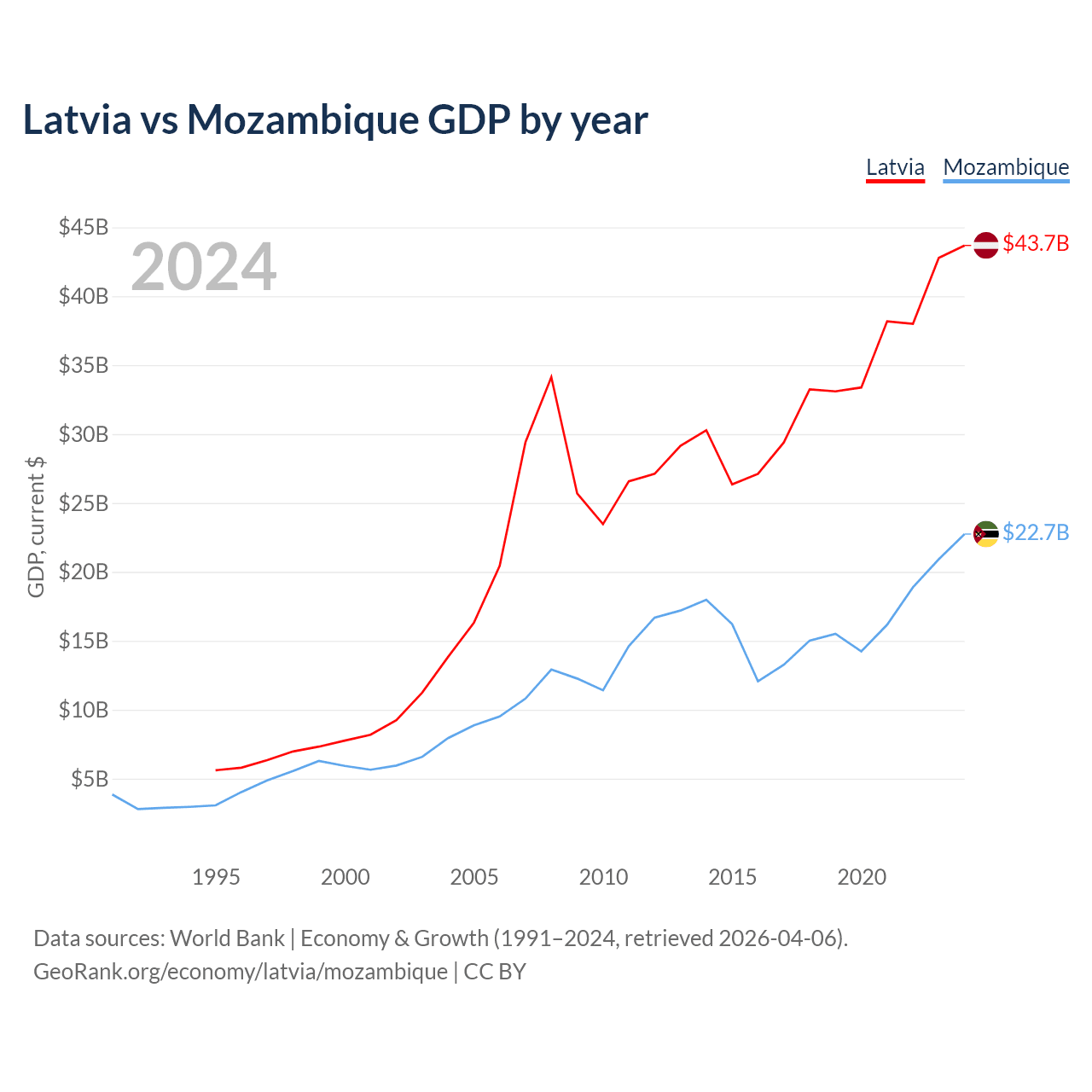 Latvia vs Mozambique GDP by year