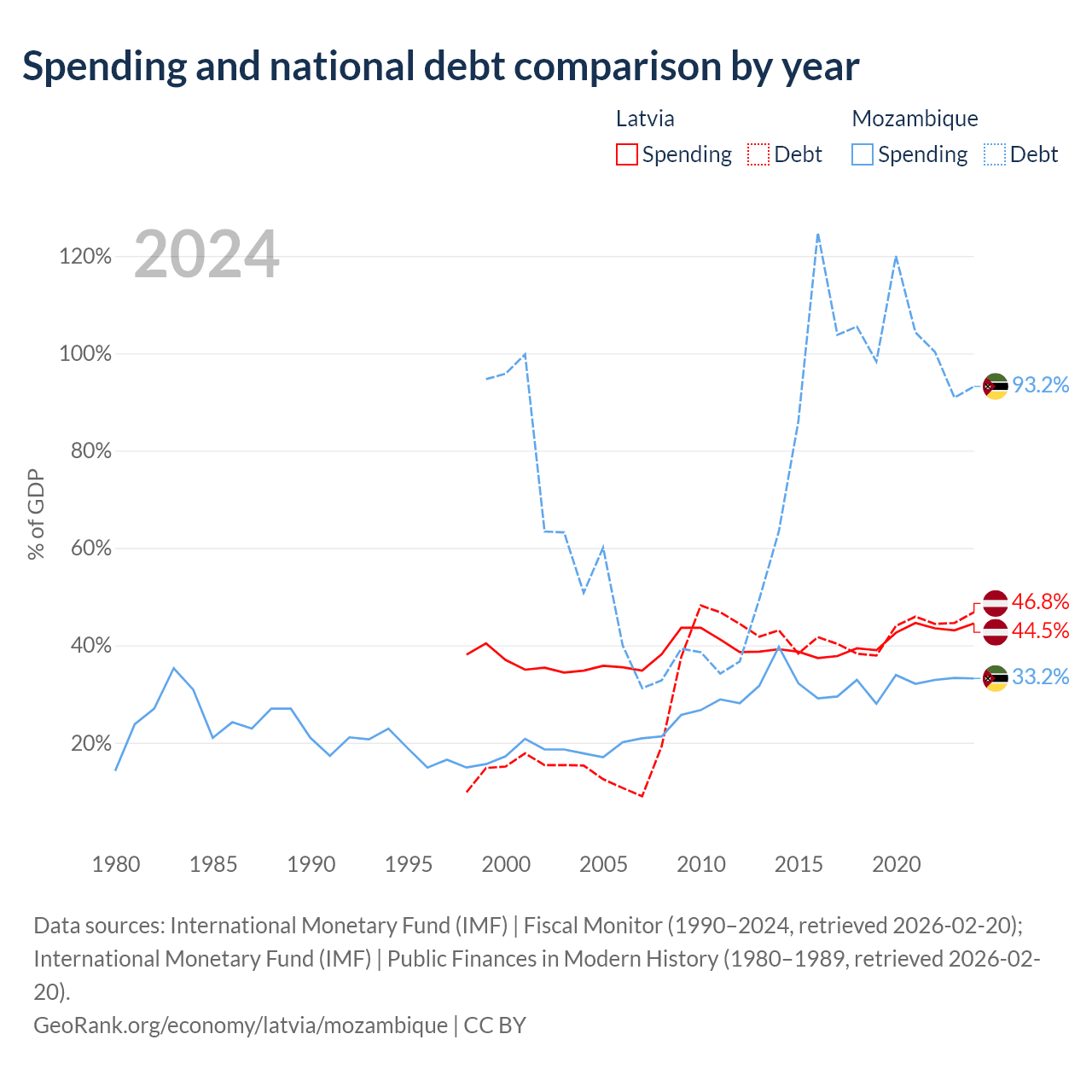 Latvia has $20.4B in government debt (46.8% of GDP), compared to $21.2B (93.2% of GDP) in Mozambique.