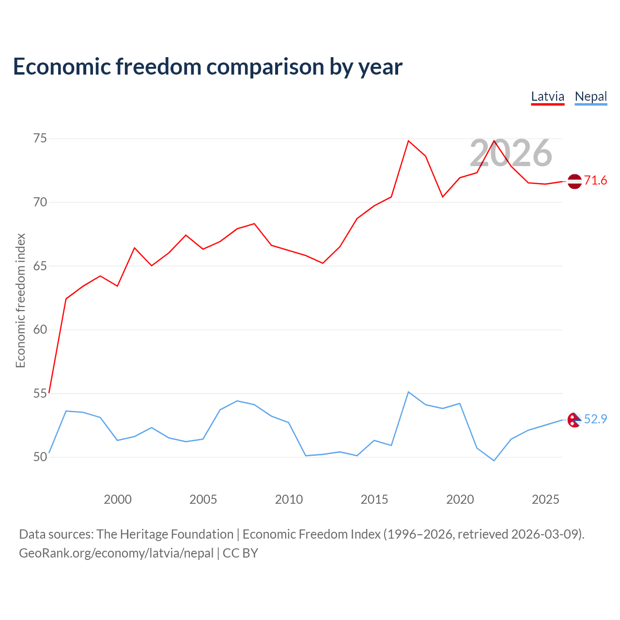 The Economic Freedom Index for Latvia is 71.6, ranking 31/197, compared to 52.9 for Nepal, ranking 144/197. The chart above displays a comparison of annual changes in economic freedom indexes.