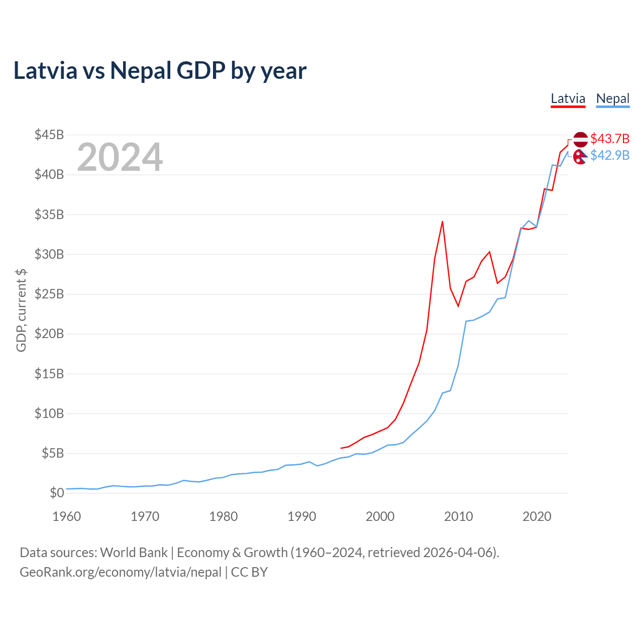 Latvia vs Nepal GDP by year