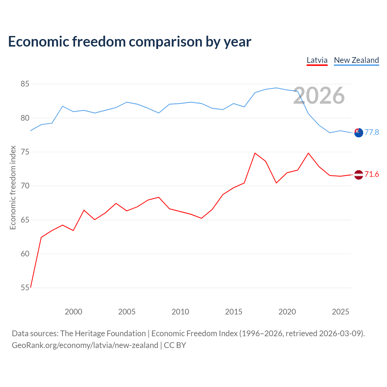 The Economic Freedom Index for Latvia is 71.6, ranking 31/197, compared to 77.8 for New Zealand, ranking 13/197. The chart above displays a comparison of annual changes in economic freedom indexes.