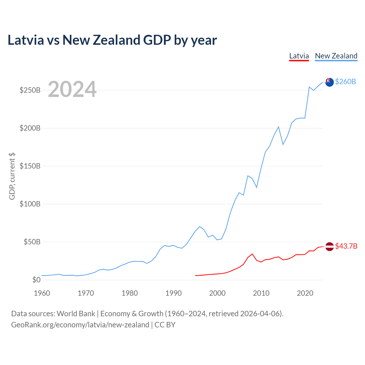 Latvia has a GDP of $43.7B compared to $260B for New Zealand, ranking 99/197 and 52/197 by economy size, respectively.