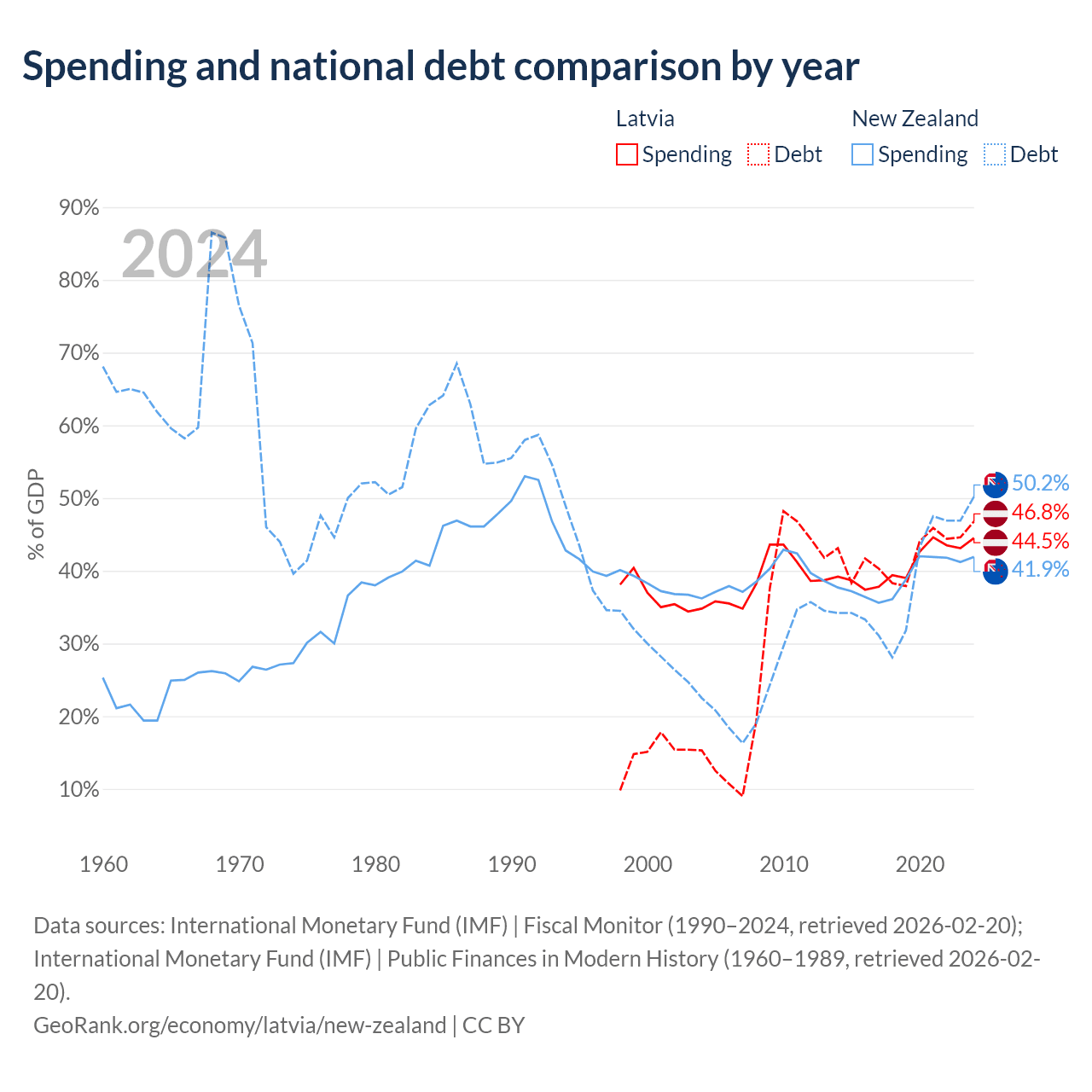 Latvia has $20.4B in government debt (46.8% of GDP), compared to $131B (50.2% of GDP) in New Zealand.