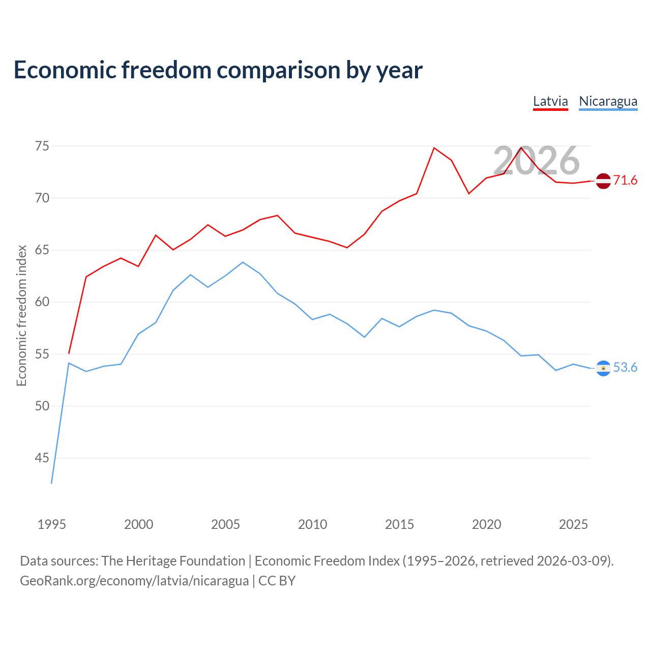 The Economic Freedom Index for Latvia is 71.6, ranking 31/197, compared to 53.6 for Nicaragua, ranking 139/197. The chart above displays a comparison of annual changes in economic freedom indexes.