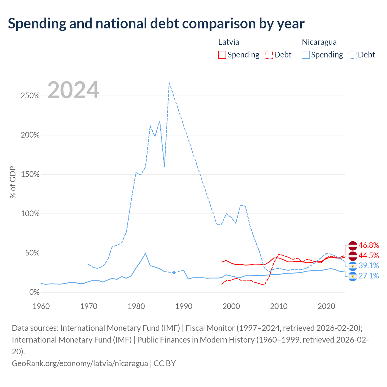 Latvia has $20.4B in government debt (46.8% of GDP), compared to $7.71B (39.1% of GDP) in Nicaragua.