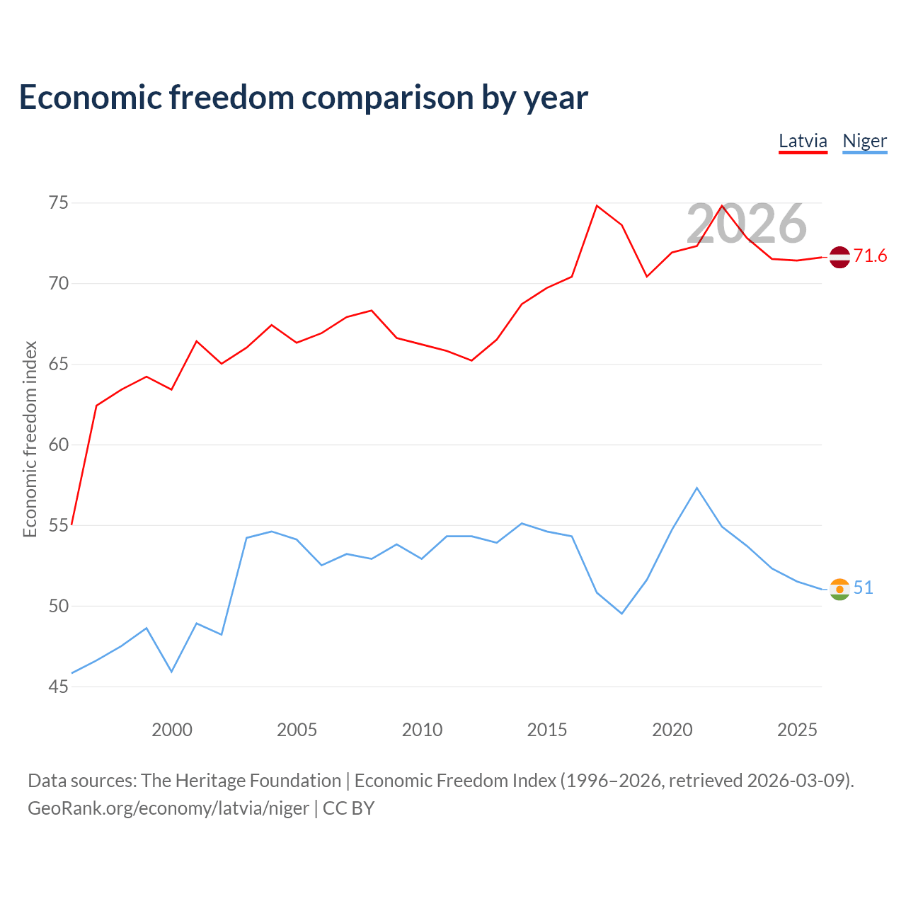 The Economic Freedom Index for Latvia is 71.6, ranking 31/197, compared to 51 for Niger, ranking 156/197. The chart above displays a comparison of annual changes in economic freedom indexes.