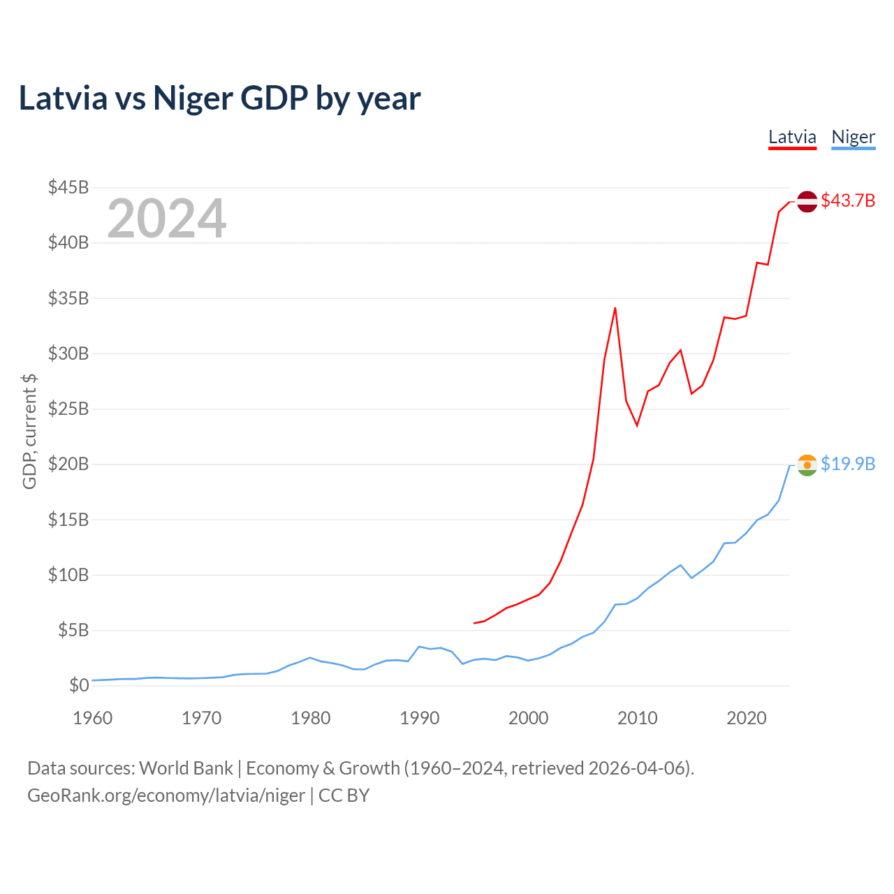 Latvia has a GDP of $43.7B compared to $19.9B for Niger, ranking 99/197 and 130/197 by economy size, respectively.