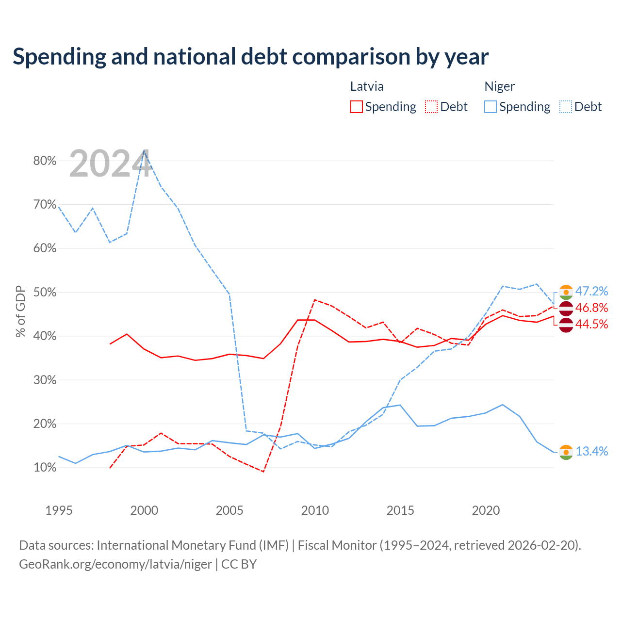 Latvia has $20.4B in government debt (46.8% of GDP), compared to $9.39B (47.2% of GDP) in Niger.