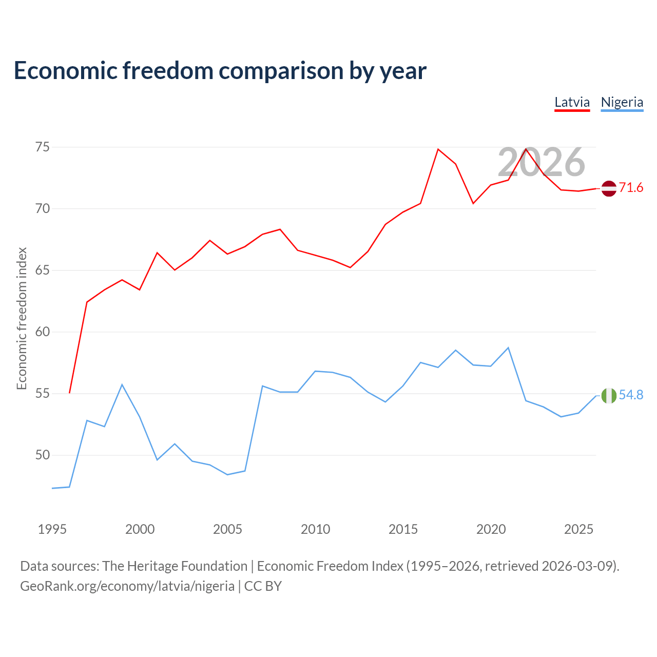 The Economic Freedom Index for Latvia is 71.6, ranking 31/197, compared to 54.8 for Nigeria, ranking 132/197. The chart above displays a comparison of annual changes in economic freedom indexes.
