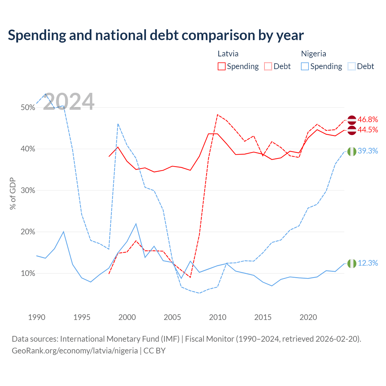 Latvia has $20.4B in government debt (46.8% of GDP), compared to $99.2B (39.3% of GDP) in Nigeria.