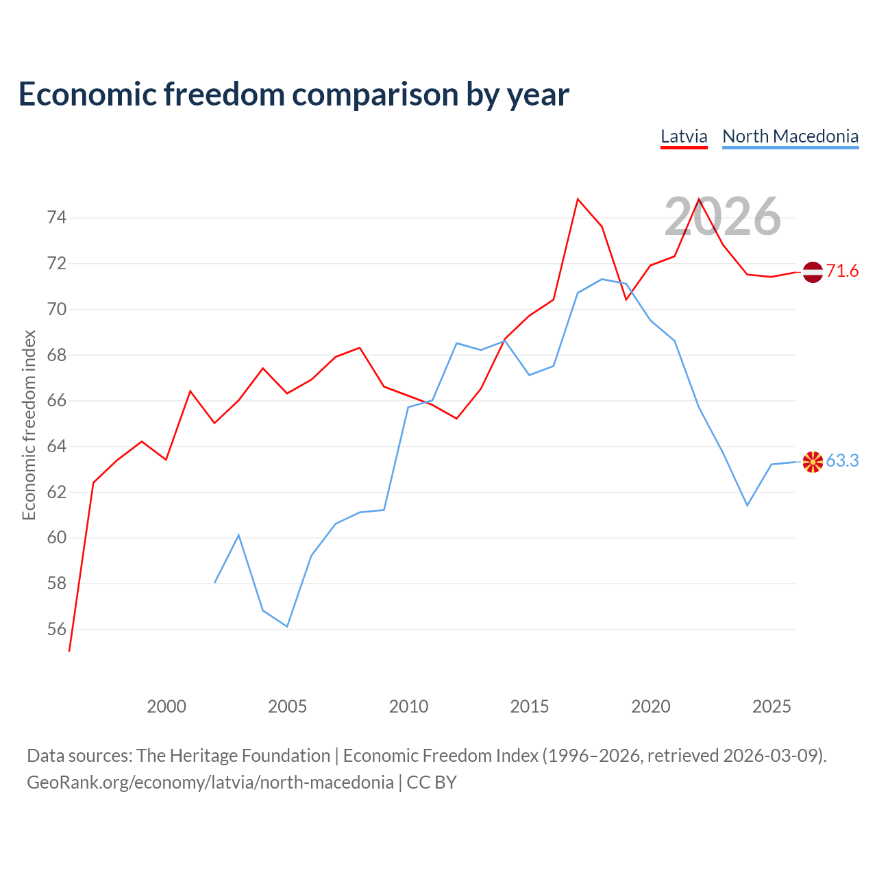 The Economic Freedom Index for Latvia is 71.6, ranking 31/197, compared to 63.3 for North Macedonia, ranking 81/197. The chart above displays a comparison of annual changes in economic freedom indexes.