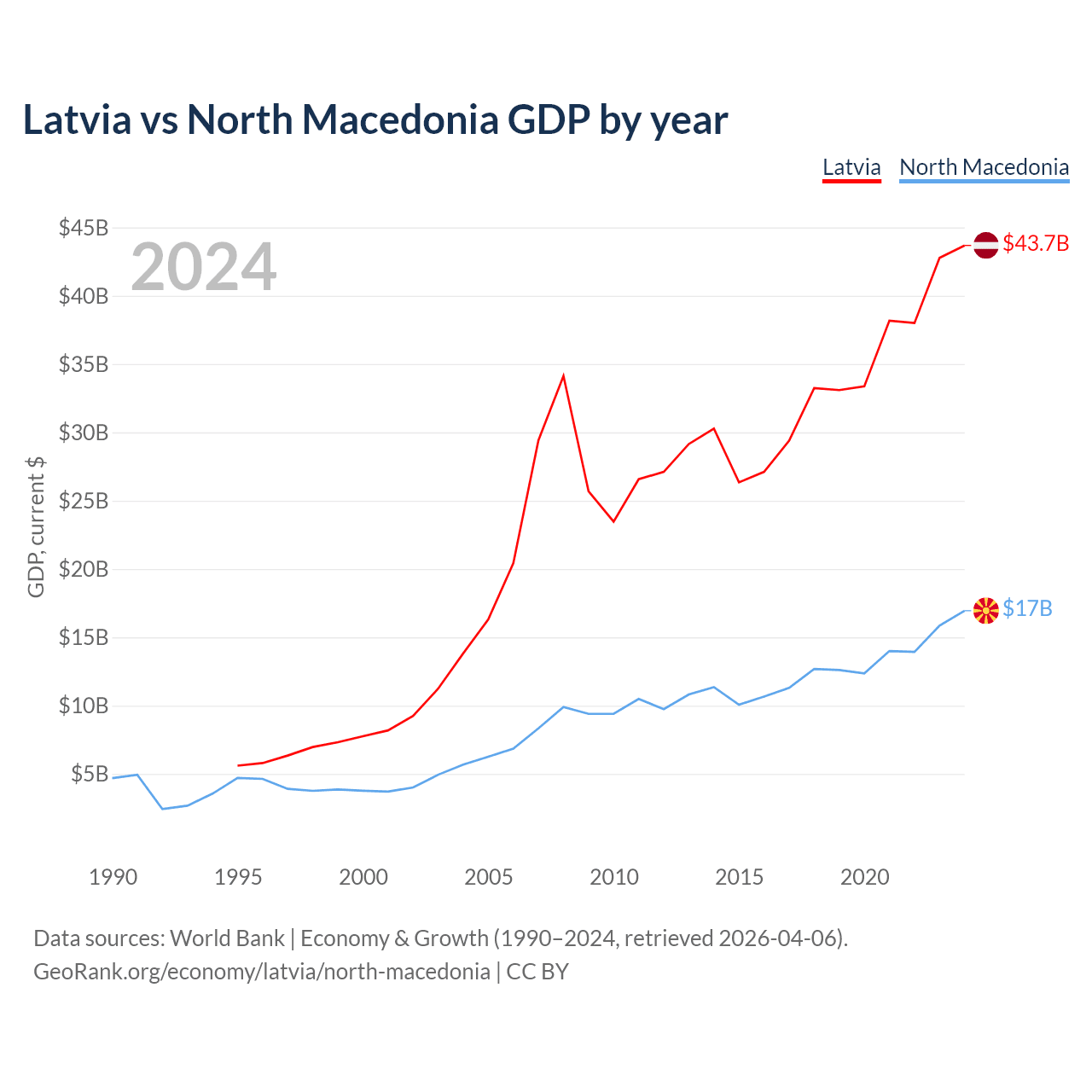 Latvia has a GDP of $43.7B compared to $17B for North Macedonia, ranking 99/197 and 138/197 by economy size, respectively.