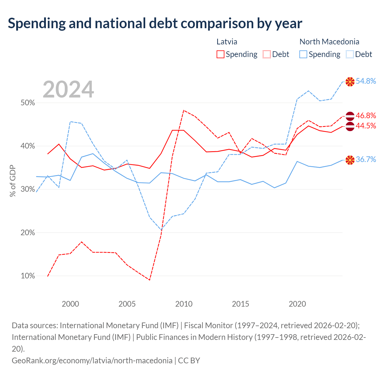 Latvia has $20.4B in government debt (46.8% of GDP), compared to $9.3B (54.8% of GDP) in North Macedonia.