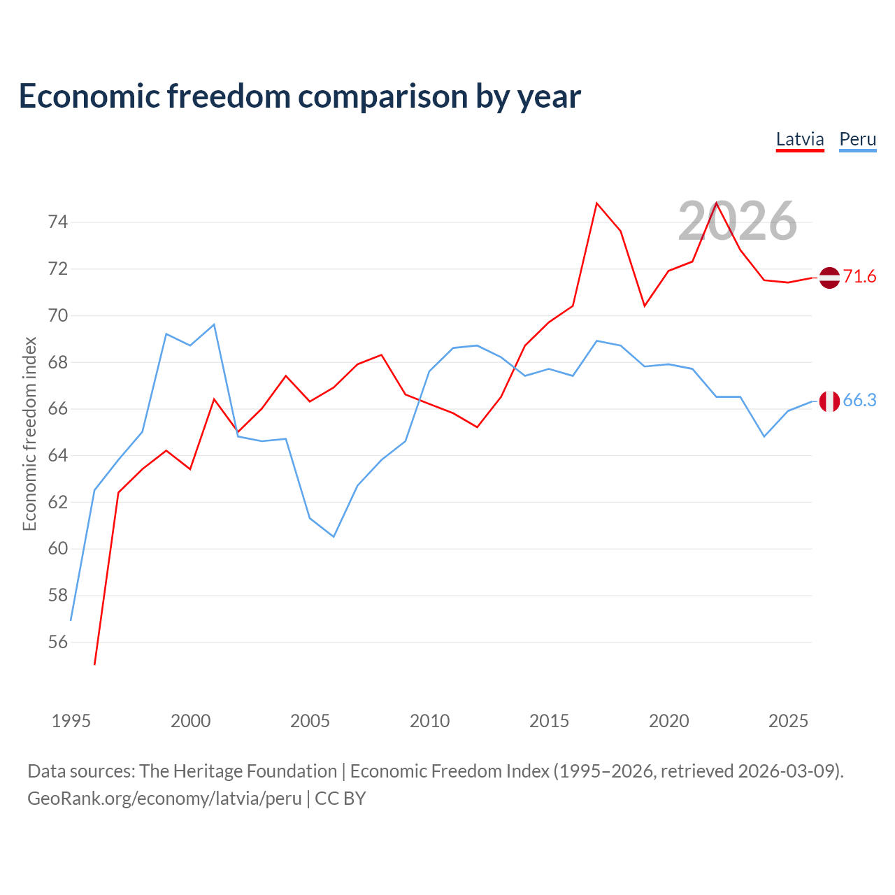 The Economic Freedom Index for Latvia is 71.6, ranking 31/197, compared to 66.3 for Peru, ranking 62/197. The chart above displays a comparison of annual changes in economic freedom indexes.