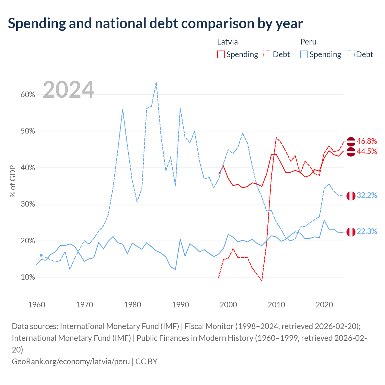 Latvia has $20.4B in government debt (46.8% of GDP), compared to $93B (32.2% of GDP) in Peru.