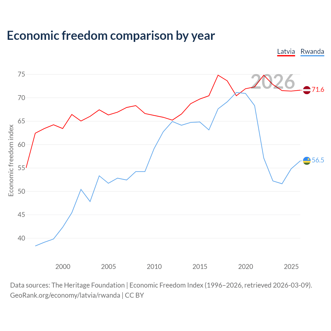 The Economic Freedom Index for Latvia is 71.6, ranking 31/197, compared to 56.5 for Rwanda, ranking 121/197. The chart above displays a comparison of annual changes in economic freedom indexes.