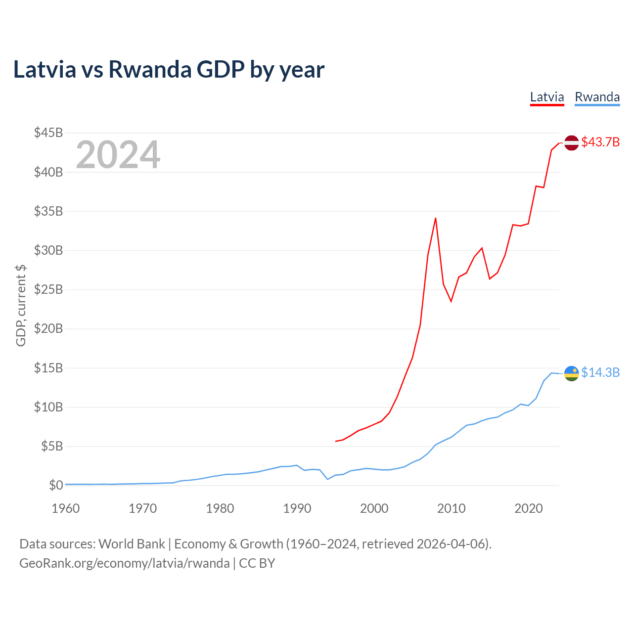 Latvia has a GDP of $43.7B compared to $14.3B for Rwanda, ranking 99/197 and 144/197 by economy size, respectively.