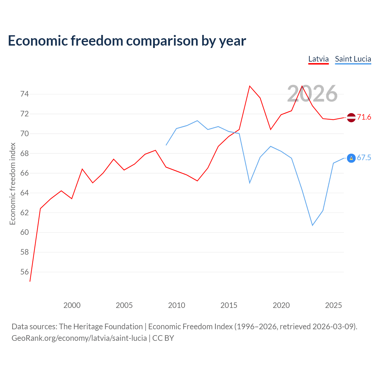 The Economic Freedom Index for Latvia is 71.6, ranking 31/197, compared to 67.5 for Saint Lucia, ranking 57/197. The chart above displays a comparison of annual changes in economic freedom indexes.