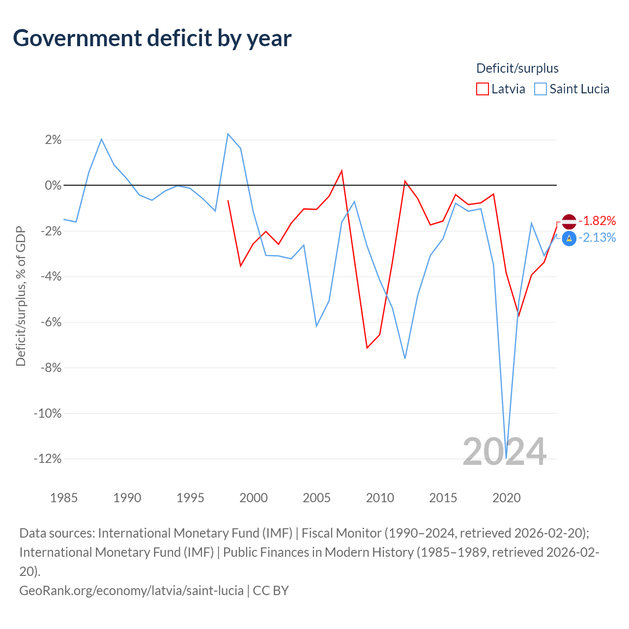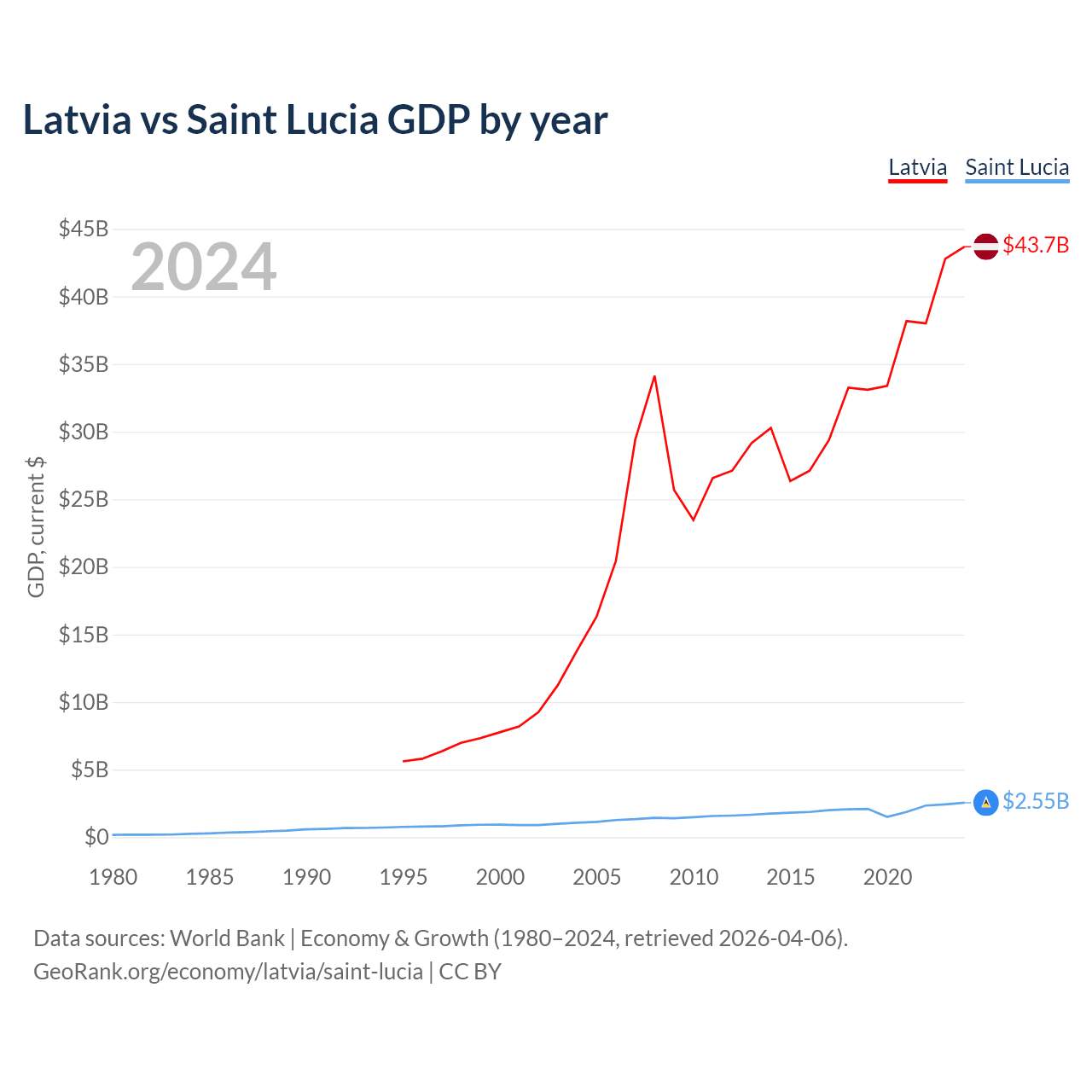 Latvia has a GDP of $43.7B compared to $2.55B for Saint Lucia, ranking 99/197 and 173/197 by economy size, respectively.