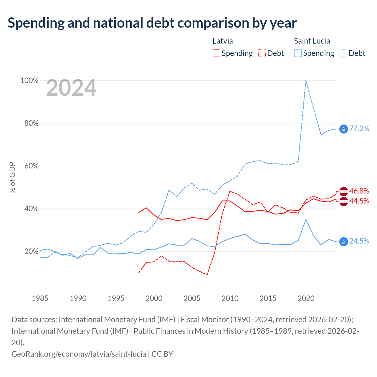 Latvia has $20.4B in government debt (46.8% of GDP), compared to $1.97B (77.2% of GDP) in Saint Lucia.