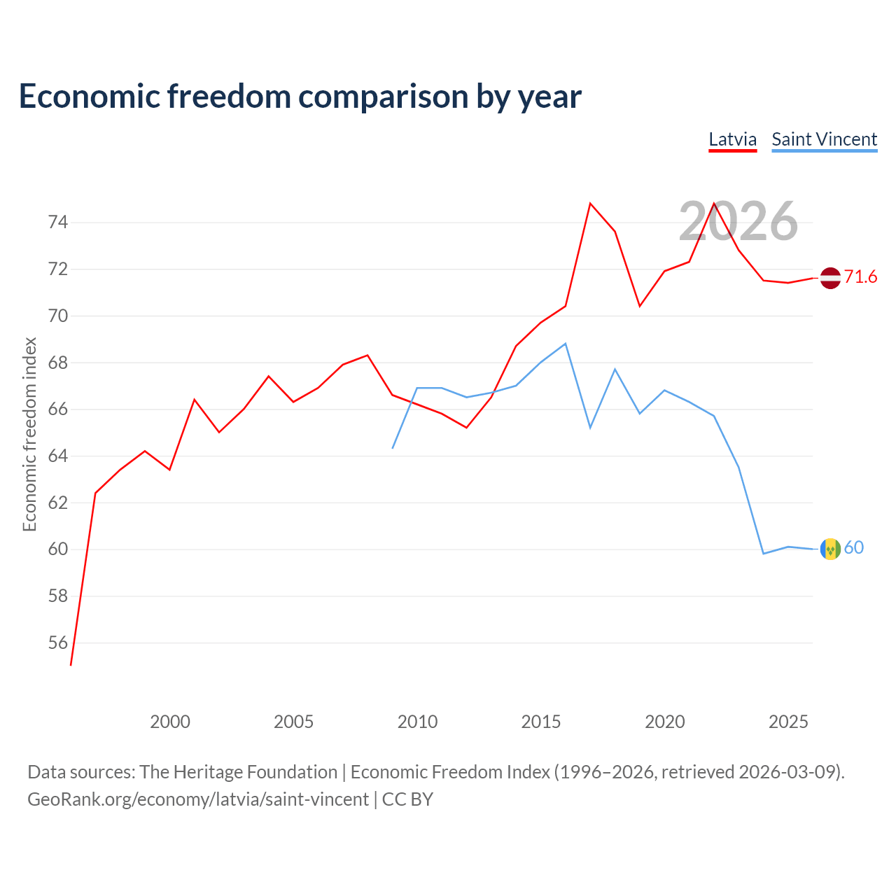 The Economic Freedom Index for Latvia is 71.6, ranking 31/197, compared to 60 for Saint Vincent, ranking 98/197. The chart above displays a comparison of annual changes in economic freedom indexes.