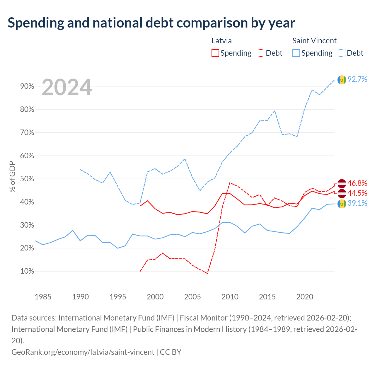 Latvia has $20.4B in government debt (46.8% of GDP), compared to $1.07B (92.7% of GDP) in Saint Vincent.