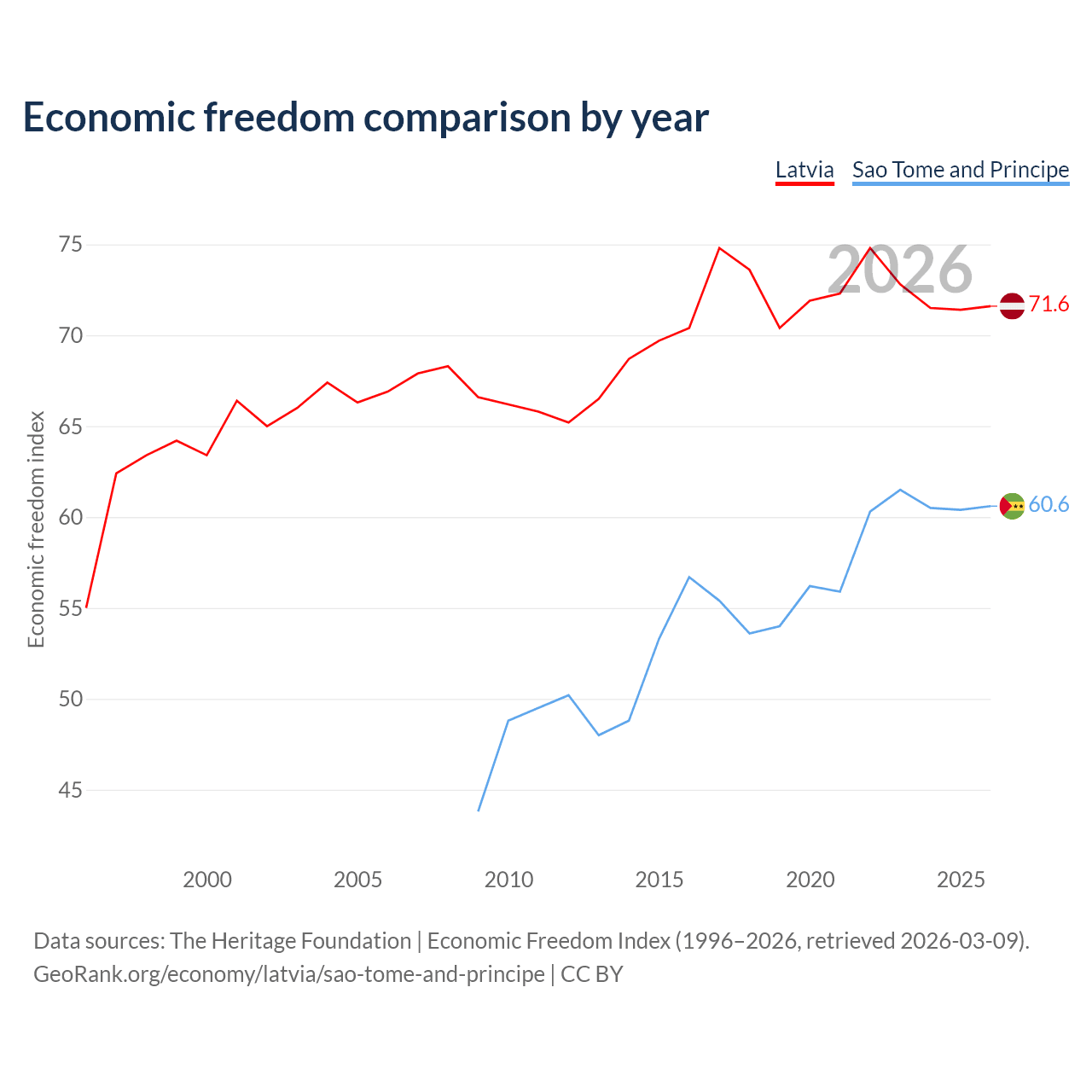 The Economic Freedom Index for Latvia is 71.6, ranking 31/197, compared to 60.6 for Sao Tome and Principe, ranking 93/197. The chart above displays a comparison of annual changes in economic freedom indexes.