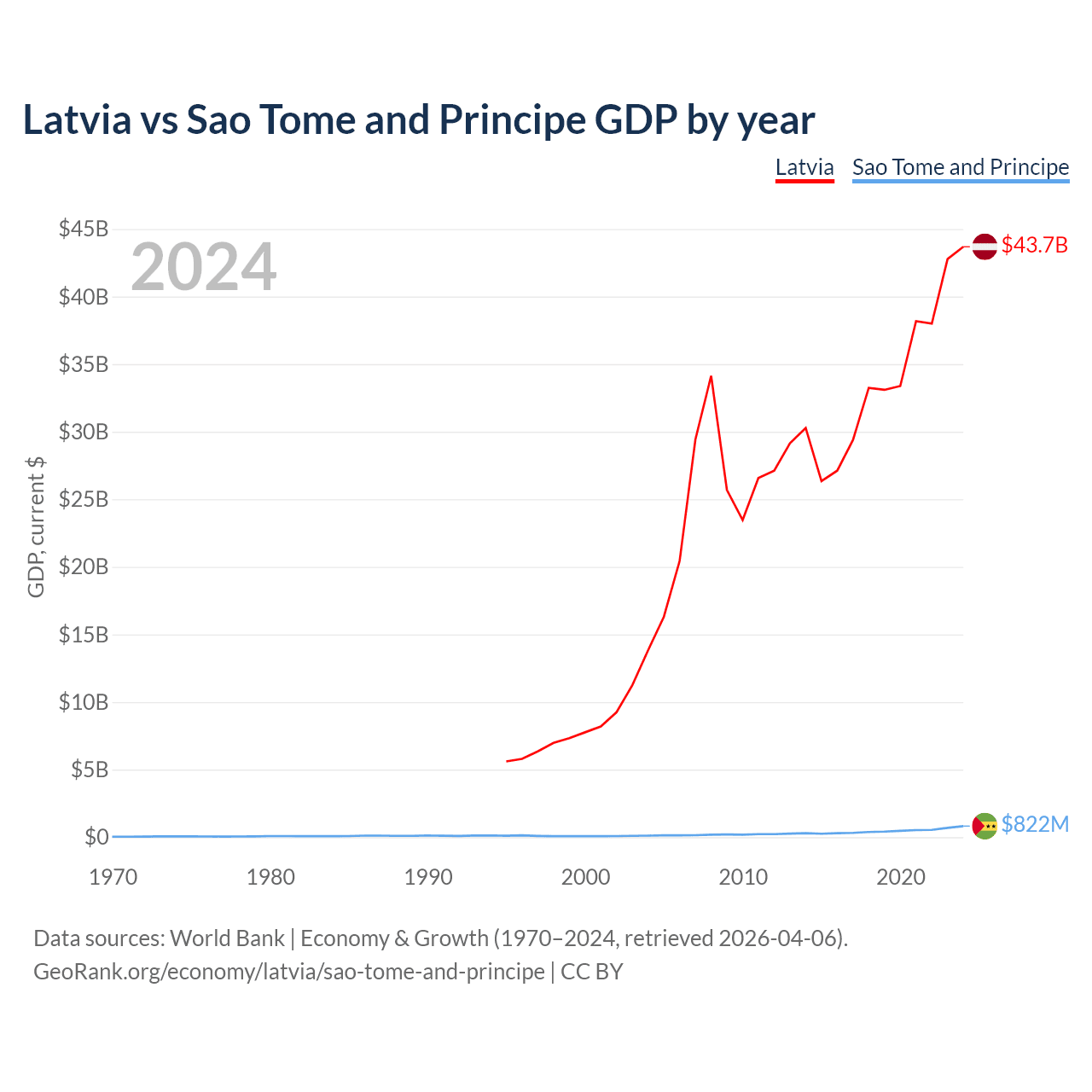 Latvia has a GDP of $43.7B compared to $822M for Sao Tome and Principe, ranking 99/197 and 189/197 by economy size, respectively.